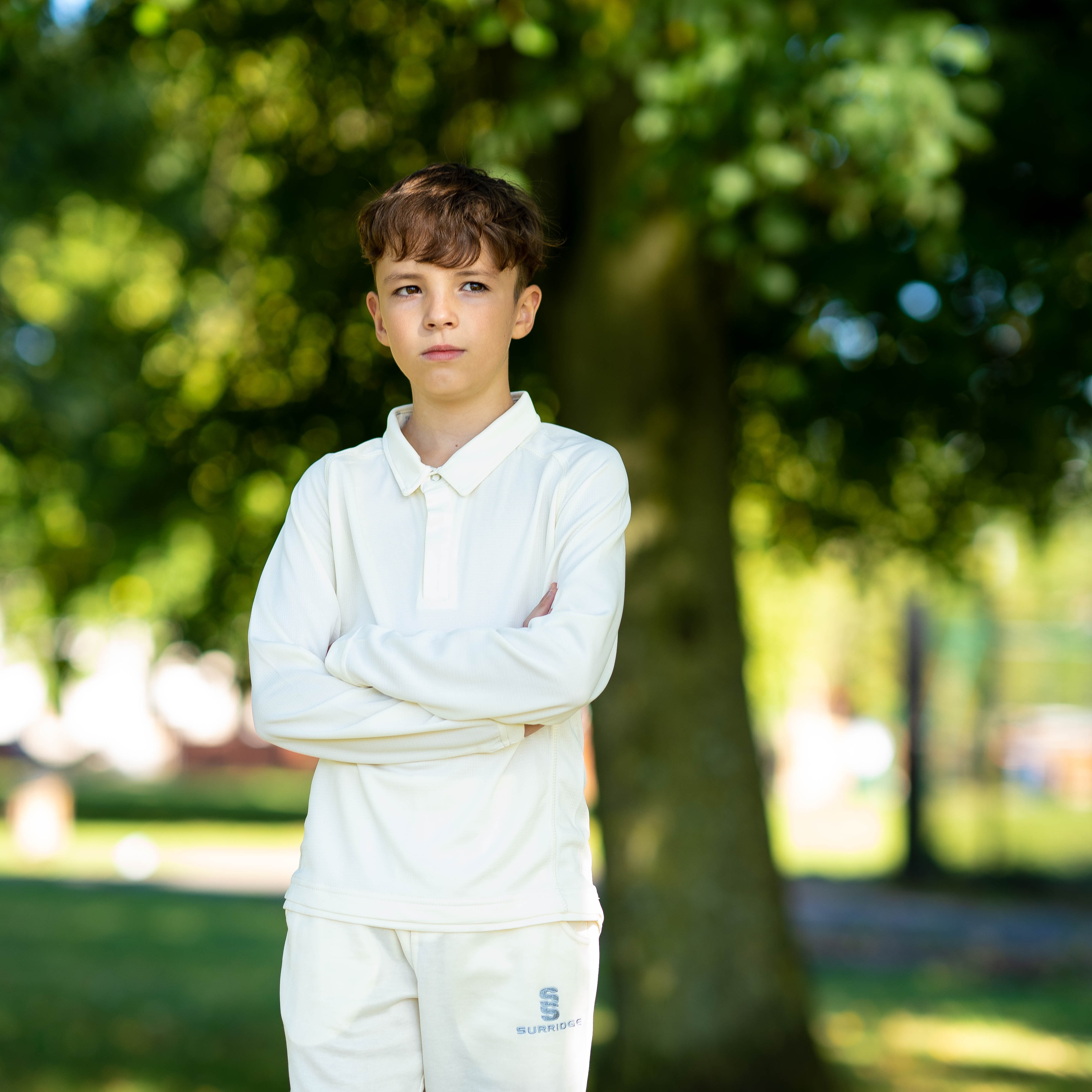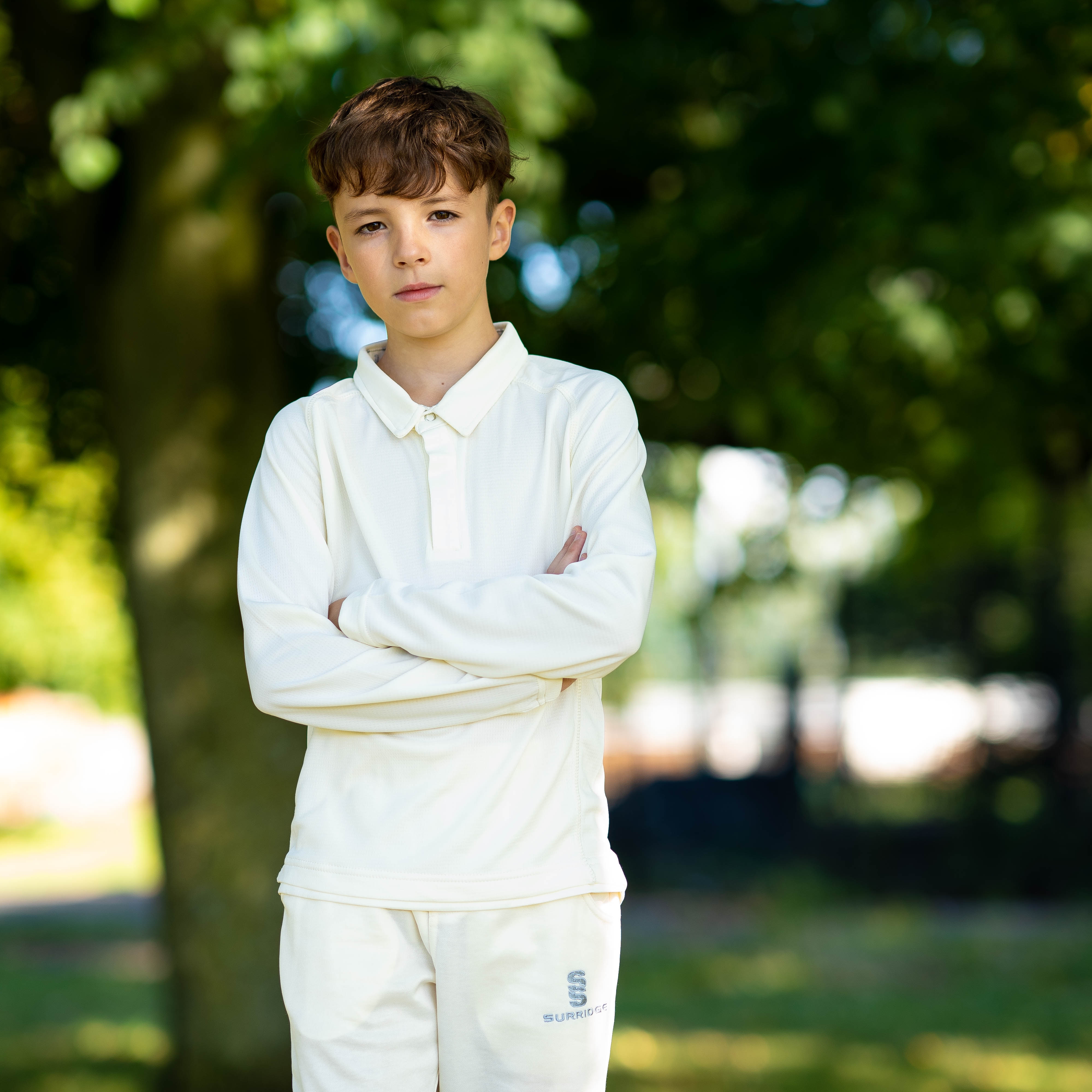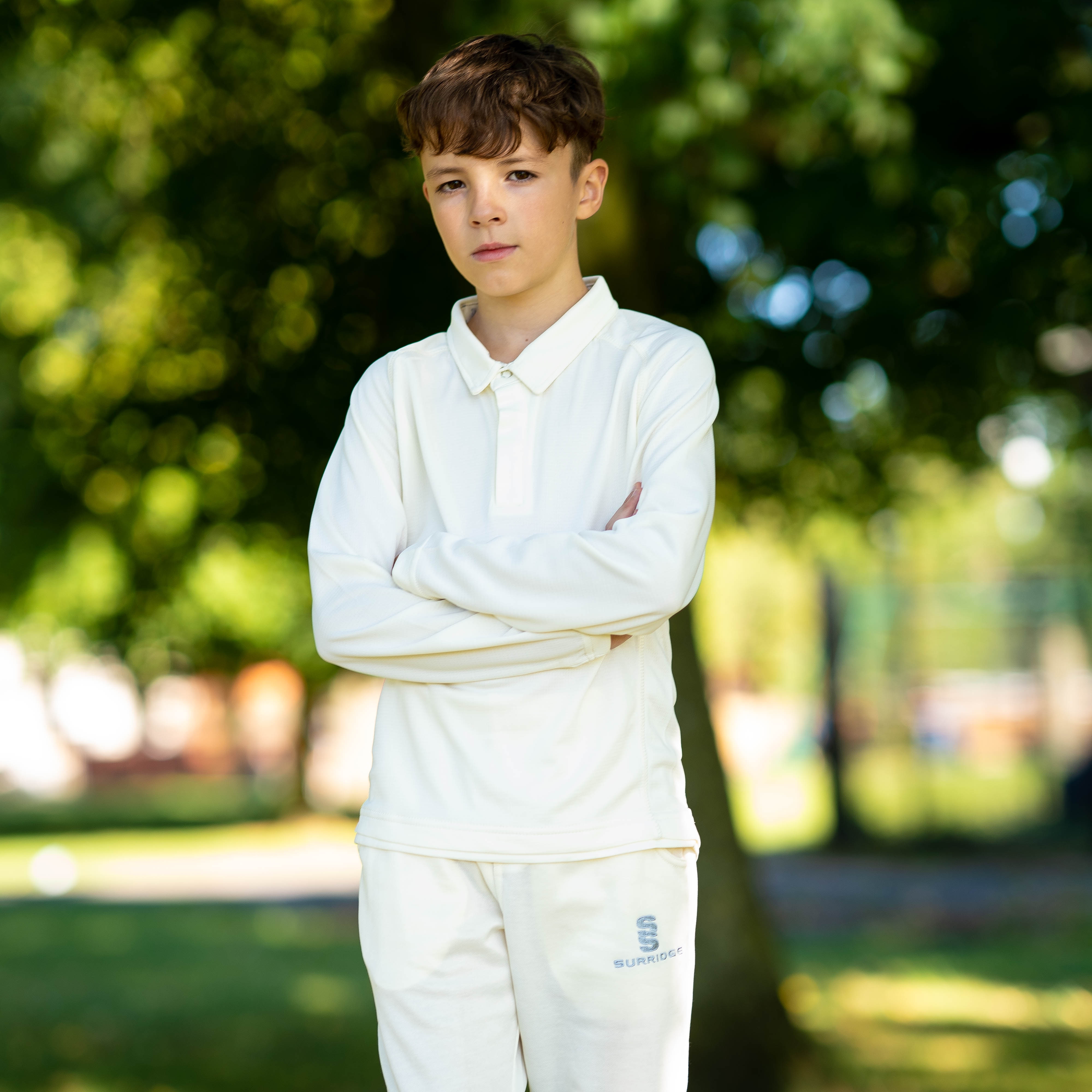 Modern fitted collared cricket shirt with pop studs ad self fabric collar.